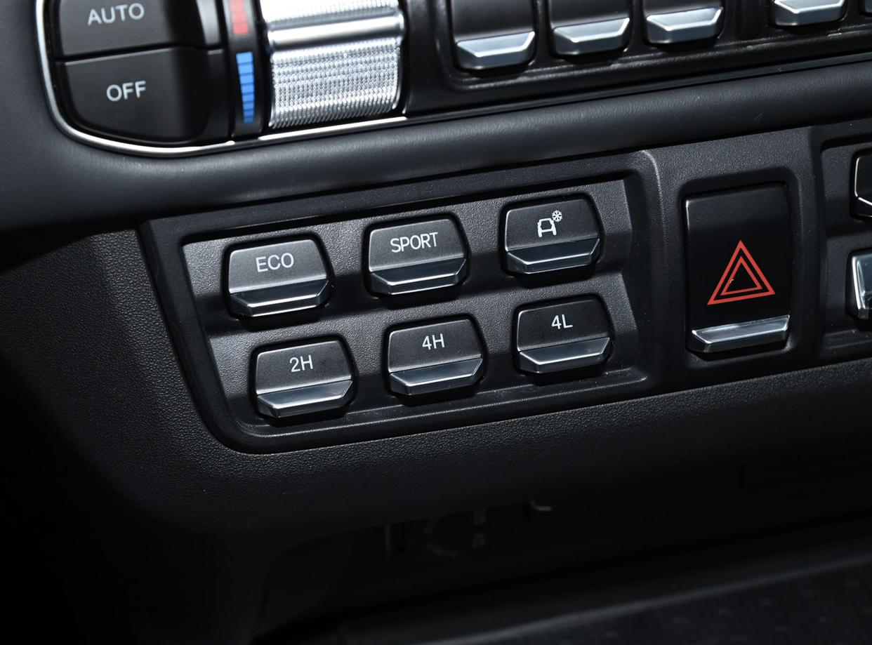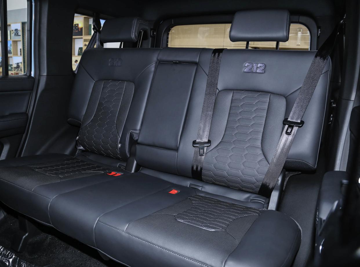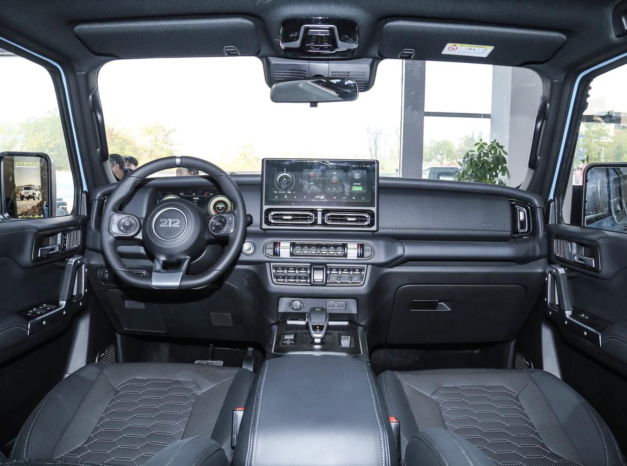进入座舱内部,212 T01检阅官与普通版的212 T01并无太大差异,采用了大面积黑色真皮材质的包裹,还加入了大颗粒按键设计,随处可见的拉手、铆钉装饰以及物理按键,也带来了更多的机械感。三辐式方向盘正中央还印有212徽标,两侧加入了形态各异的多功能按键,12点方向加入金属回正标识,再搭配着符合人体工程学的换挡手柄,也带来了不一样的操控体验。全液晶仪表、悬浮式中控液晶大屏,并支持在线音乐/导航、智能语音等功能,营造出科技氛围。细节方面,该车配备了别致的空调出风口、大颗粒按键、2H/4H/4L小尺寸波动按钮,还带有2把差速锁标识的金属按钮。