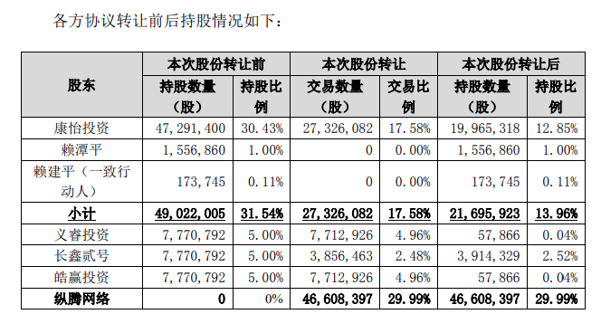 康怡投资、义睿投资、长鑫贰号、皓赢投资(合称“股份转让方”)向纵腾网络转让上市公司4661万股普通股股份,占上市公司总股本的29.99%的股份,本次股份转让完成后,公司控股股东将由康怡投资变更为纵腾网络,实际控制人将由赖潭平变更为王钻。