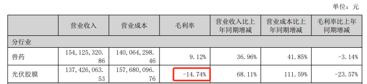 绿康生化成立于2003年,2017年以兽药研发生产为主业登陆深交所主板。上市当年公司归母净利润尚达8593万元,此后公司业绩却连年下滑。2023年,绿康生化跨界光伏胶膜业务,但因原材料价格下跌、市场供需调整等问题,2024年上半年该业务毛利率跌至-14.74%。