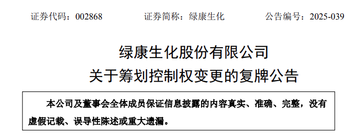 本次股份转让完成后,纵腾网络将持有绿康生化29.99%的股份,绿康生化控股股东将由康怡投资变更为纵腾网络。公司股票将于2025年4月28日(星期一)开市起复牌。