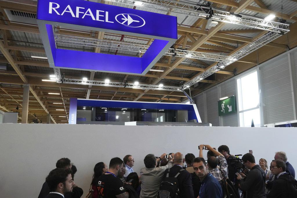 当地时间2025年6月16日,法国巴黎勒布尔歇,记者们在巴黎航展上聚集在以色列拉斐尔先进防御系统公司的展台前。